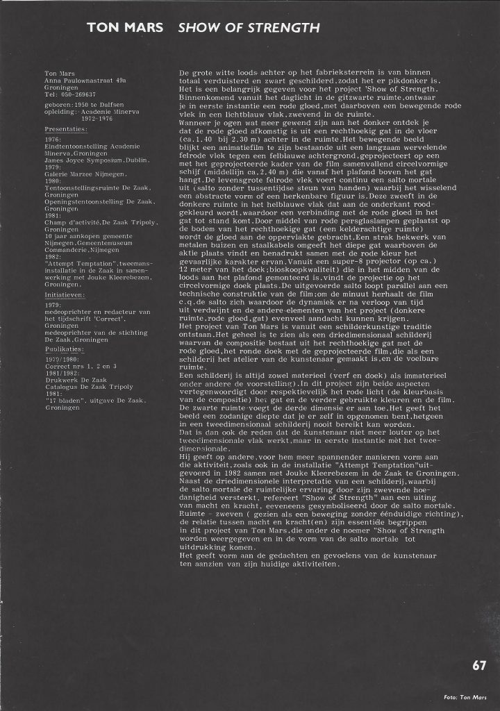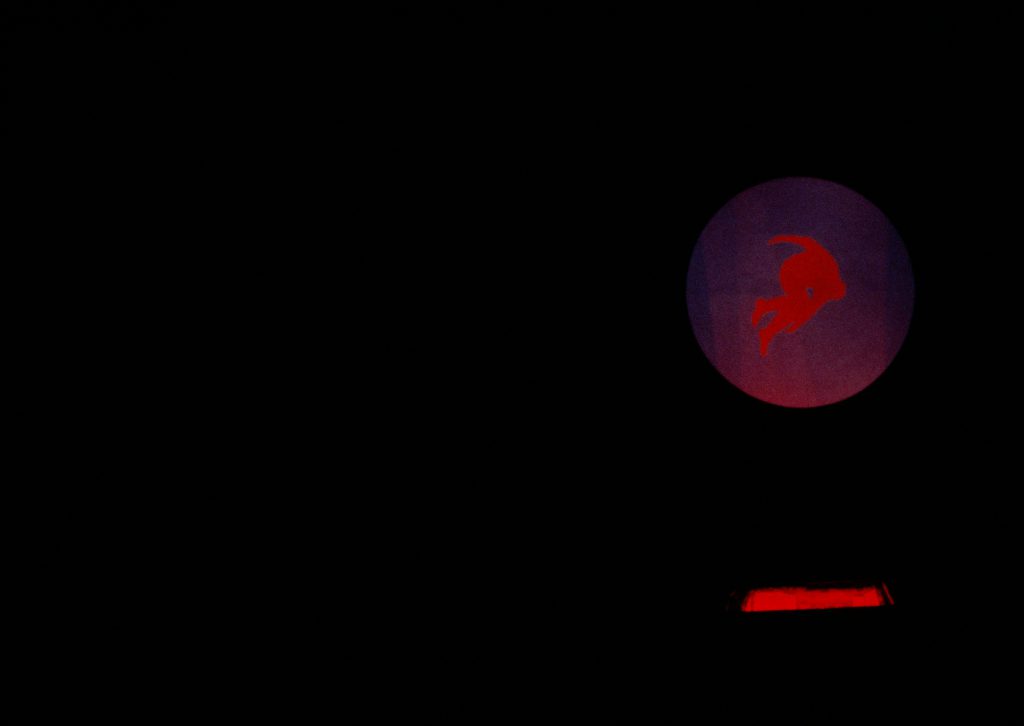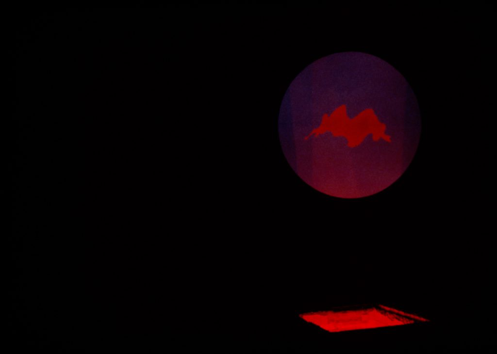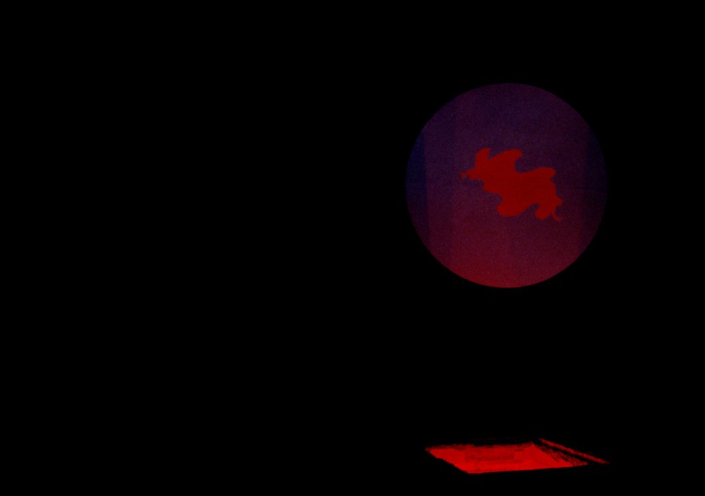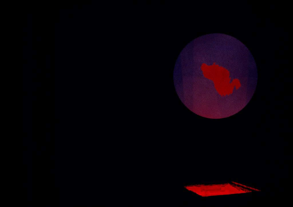 Installation: dark space (ca.30×15 m.), film animation (changing red figure on blue), circular projection screen (ca. 250 cm.), cellar opening with red light